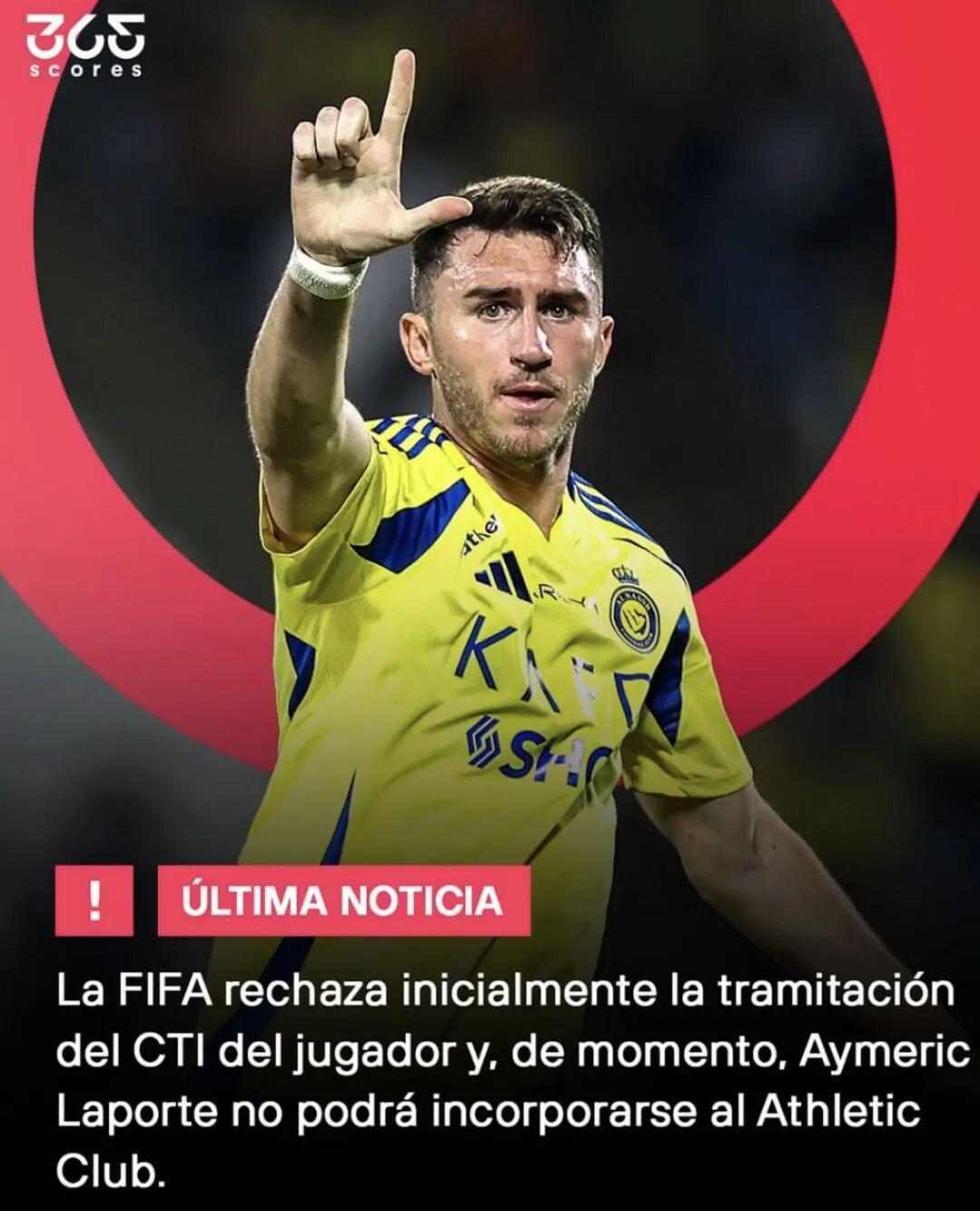 “毕尔巴鄂竞技俱乐部谨向全体会员及球迷告知:国际足联已驳回西班牙足协向沙特阿拉伯足协申请获取国际转会证明(CTI)的请求,该证明是完成拉波尔特球员注册的必要文件。”