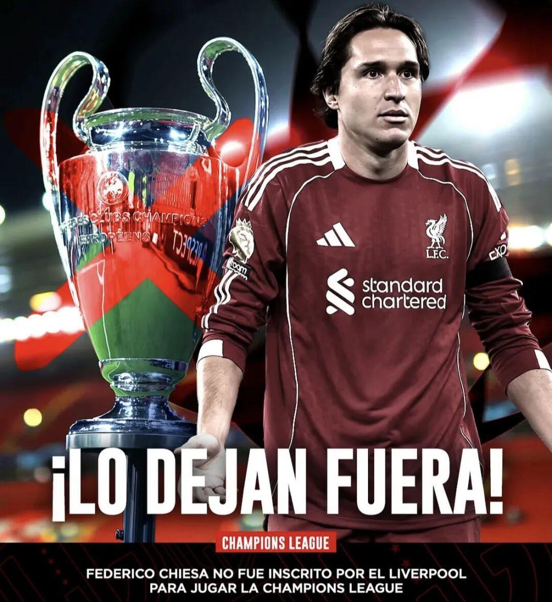 近日,据回声报的消息,利物浦已经确认22人欧冠名单,意大利边锋基耶萨缺席。